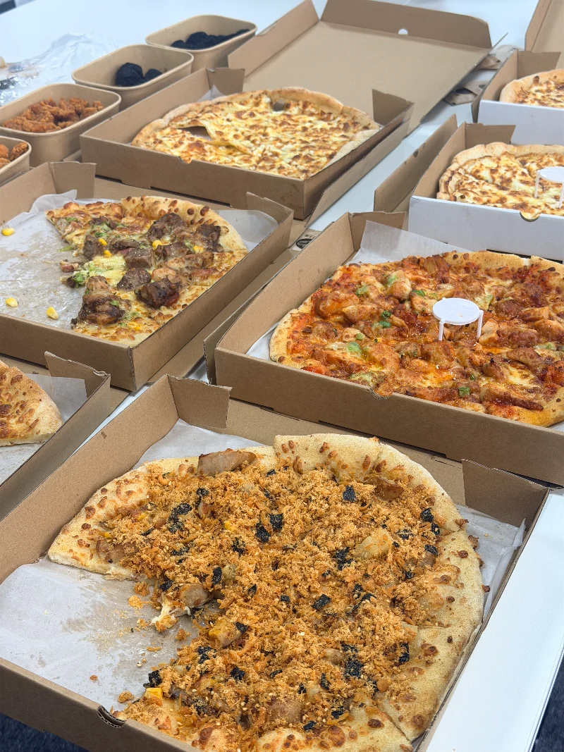 Die mit getrockneter Fleischseide und Algen belegte Pizza war eine angenehme Überraschung. Herzhaft und knusprig, kombiniert mit dem frischen Geschmack von Algen und dehnbarem Käse. Ein einzigartiger Geschmack, der sofort nach seiner Ankunft vom Tisch verschwand. Jeder wollte es zuerst einmal ausprobieren. Für Fotos kamen Handys heraus und Gelächter erfüllte den Raum.